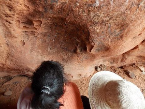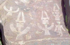 La piedra de Mulahuada, entre otras cosas, nos presenta figuras que, acaso, no sean más que una sola proyectada en el tiempo. Debajo, un hombre arrodillado con los brazos a los lados, como quien venera a una deidad. Sobre él y a su izquierda hay tres figuras, una encima y dos a su lado, en las que los brazos se abren en alas, y en la cabeza tienen un rectángulo con una suerte de corona a modo de antenas o plumas. Podríamos suponer que son máscaras del hombre vestido de ave. En el extremo, un ave con las alas extendidas como si volara. A lo alto, el ave volando hacia un círculo, que podría ser la luna o el sol.